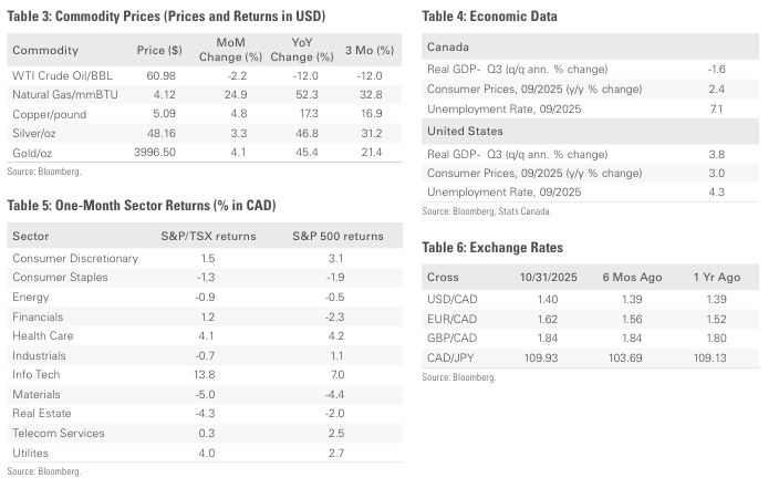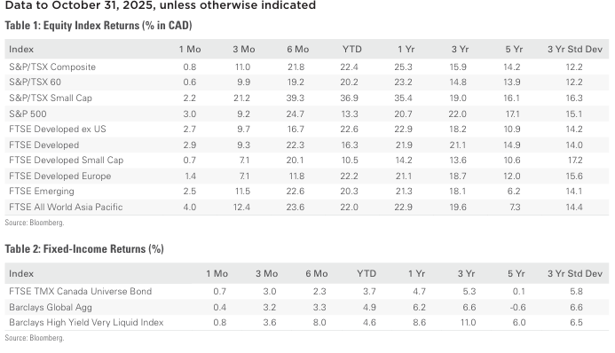 Canadian and U.S. equity markets had another positive month in October. Canada’s benchmark stock index (S&P/TSX Composite Index) marked its sixth straight monthly advance, the longest such streak since 2021. U.S. equities hit record highs in October amid easing U.S.-China trade tensions, an interest-rate cut by the U.S. Federal Reserve (the Fed), robust corporate earnings, and an ongoing government shutdown. The S&P 500 Index recorded its sixth consecutive monthly gain, while the Nasdaq Composite extended its streak to seven.