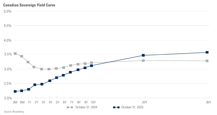 In the U.S., the official September 2025 nonfarm payrolls report was not released in light of the federal government shutdown. The consumer price index rose 0.3% in September, putting the 12-month inflation rate at 3.0%. Higher prices at the pump were partly responsible for the sustained strength in headline inflation. In its October meeting, the Fed cut its target federal funds interest rate by 25 bps, to a range of 3.75%-4.00%. The FOMC also announced an end to its “Quantitative Tightening” program as of December 1.